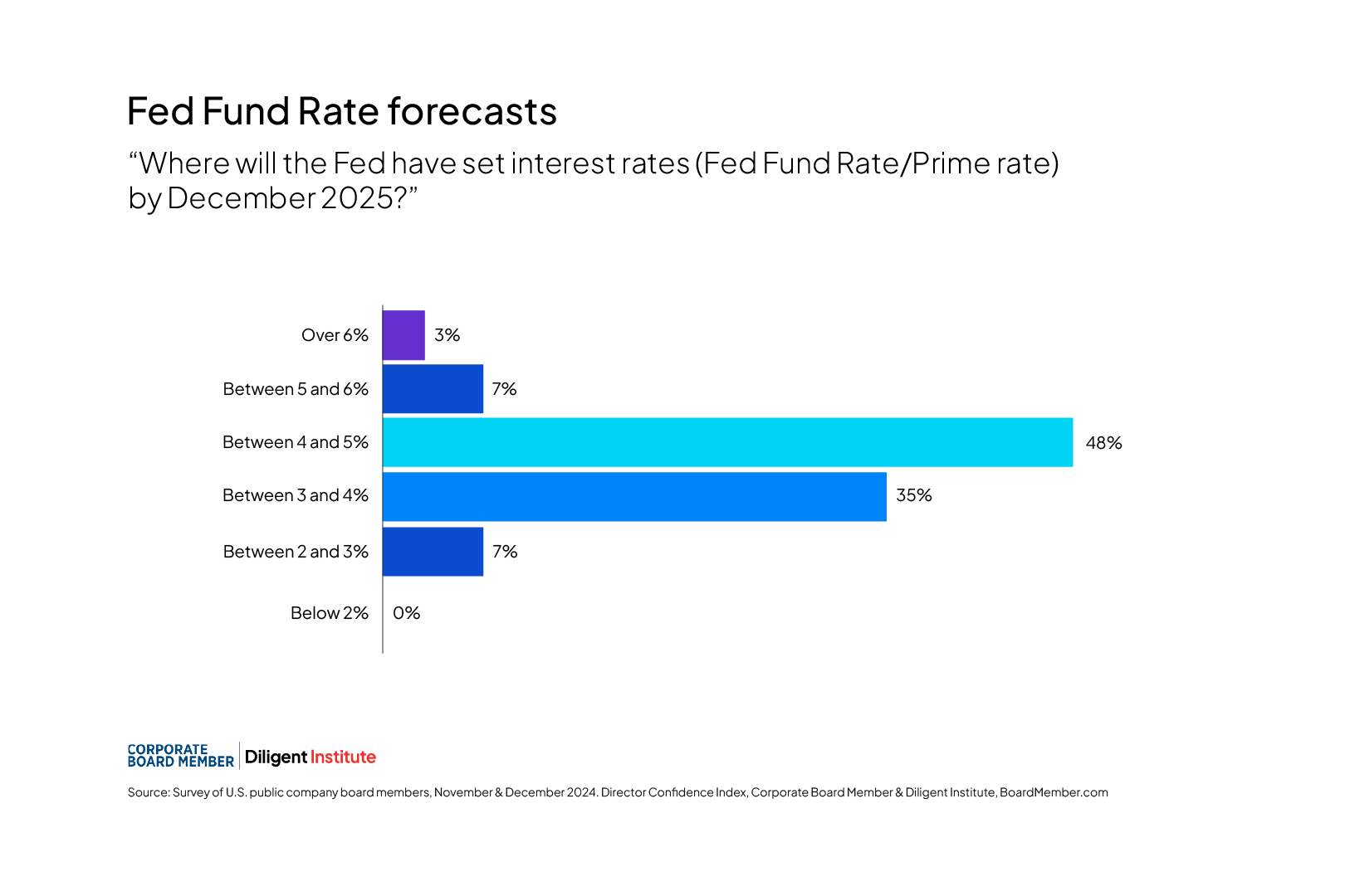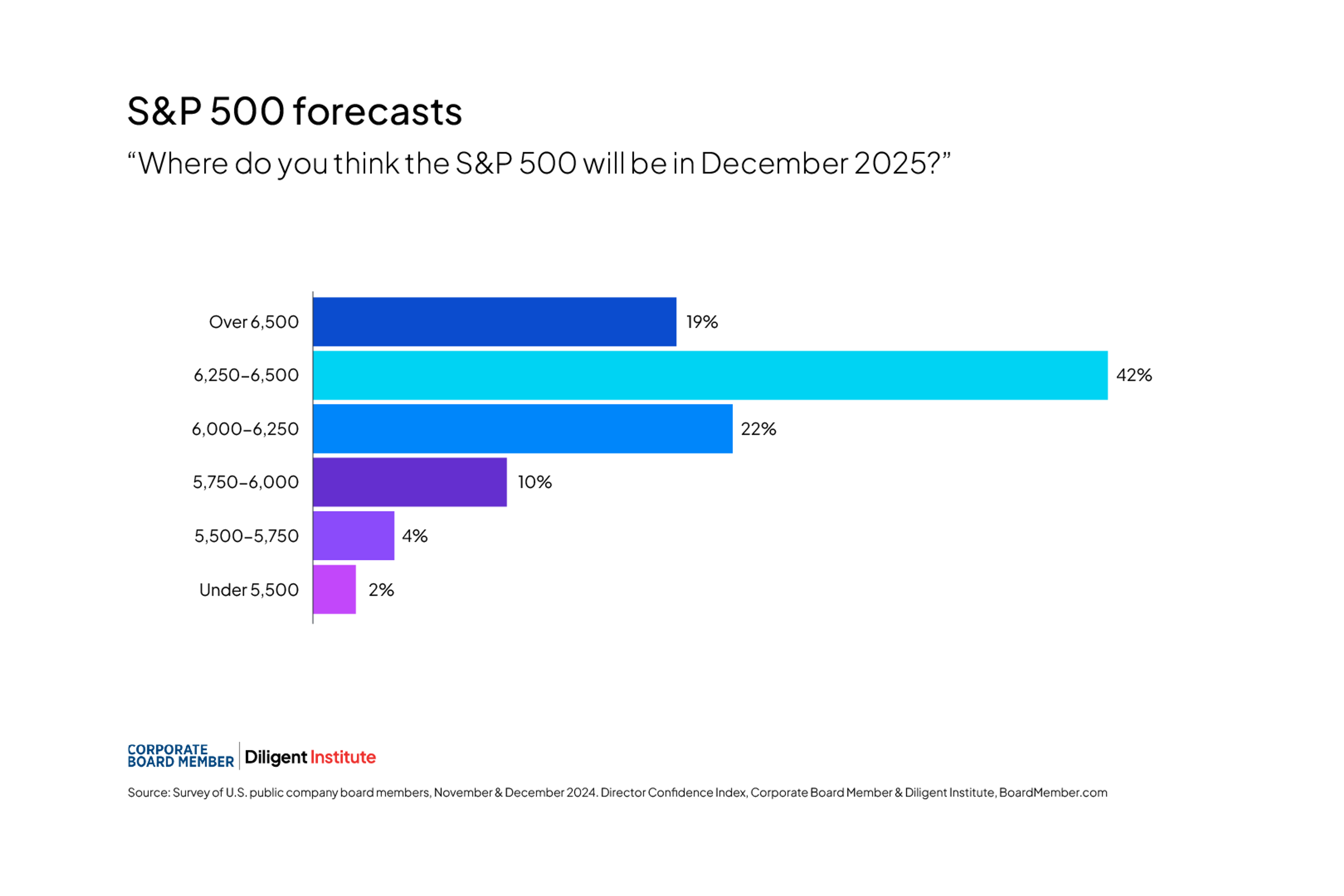 Our December poll found public company board members aren’t anticipating a boom year in 2025, with 42 percent forecasting the S&P 500 to be between 6,250 and 6,500 by December 2025, up from its level of approximately 6,000 today. “My personal estimate is 6-9 percent S&P growth in 2025,” said Ari Papoulias, who serves on the board of Nasdaq-traded United-Guardian.
