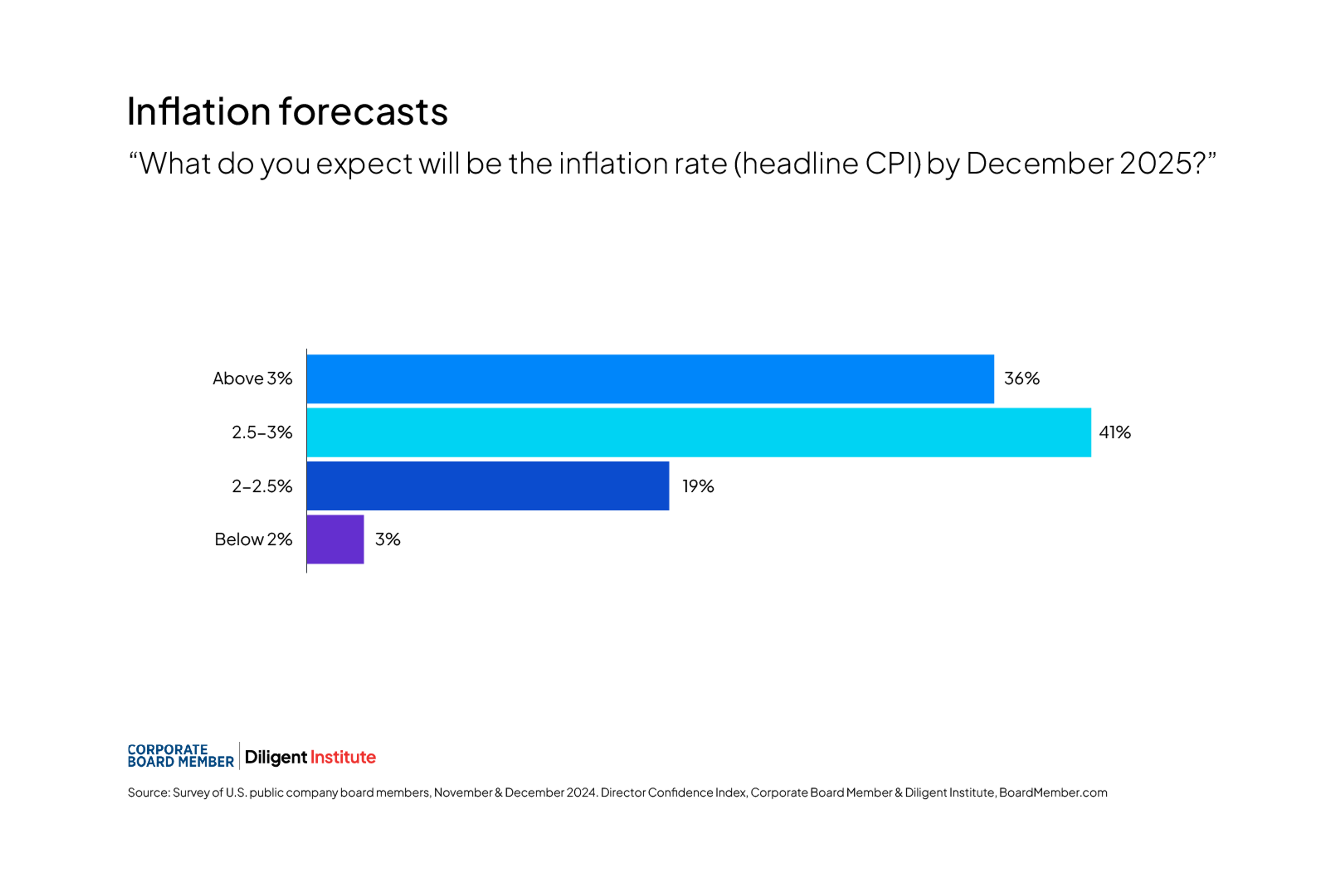 Most directors agree that the incoming administration’s proposed tariffs, if implemented, will reignite inflation in the United States. For that reason, three-quarters (77 percent) expect headline CPI to tick up—or at least hover—in 2025, with 36 percent of those saying it will climb back up over 3 percent by the end of the year.