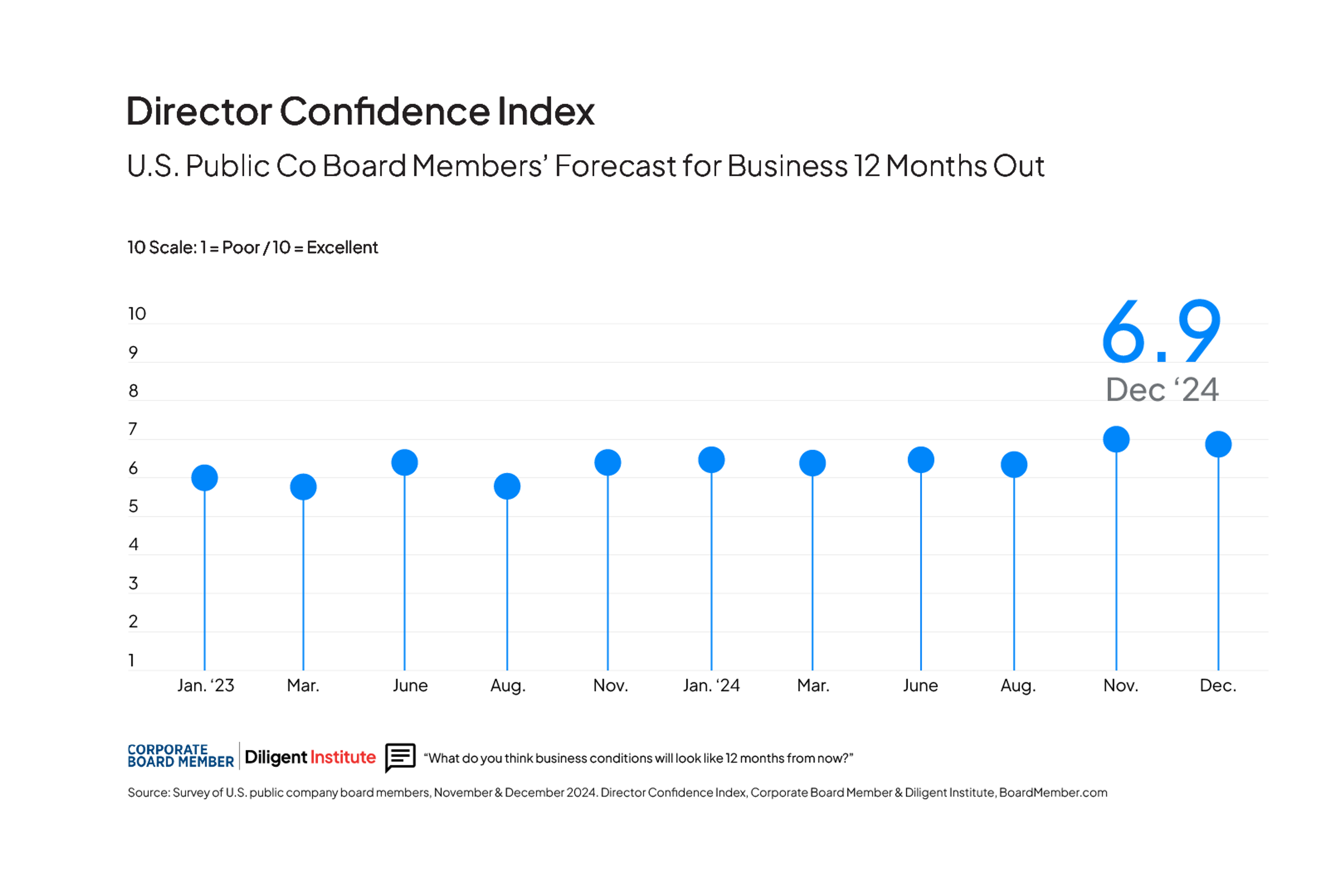 Chief Executive found a similar trend among CEOs, with a decrease of 9 percent in the proportion of CEOs who now expect business conditions to improve in 2025, vs. November. The difference, however, is that despite that shift, the CEOs polled showed much more optimism about the 2025 business environment than board members, expecting business conditions in the U.S. to hit 7.0 out of 10 by this time next year, up from their November level of 6.8—and up 10 percent from their Q3 trough.