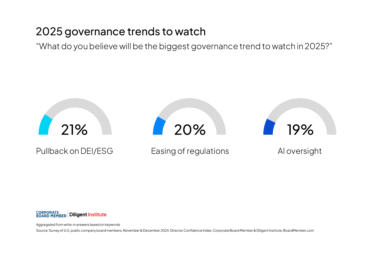 When asked more broadly what they believe will be the next big governance trend to watch in 2025, three themes emerged: a pullback on DEI/ESG initiatives (21 percent), an easing of regulations across governmental agencies (20 percent) and AI oversight, including its ethical consequences (19 percent).