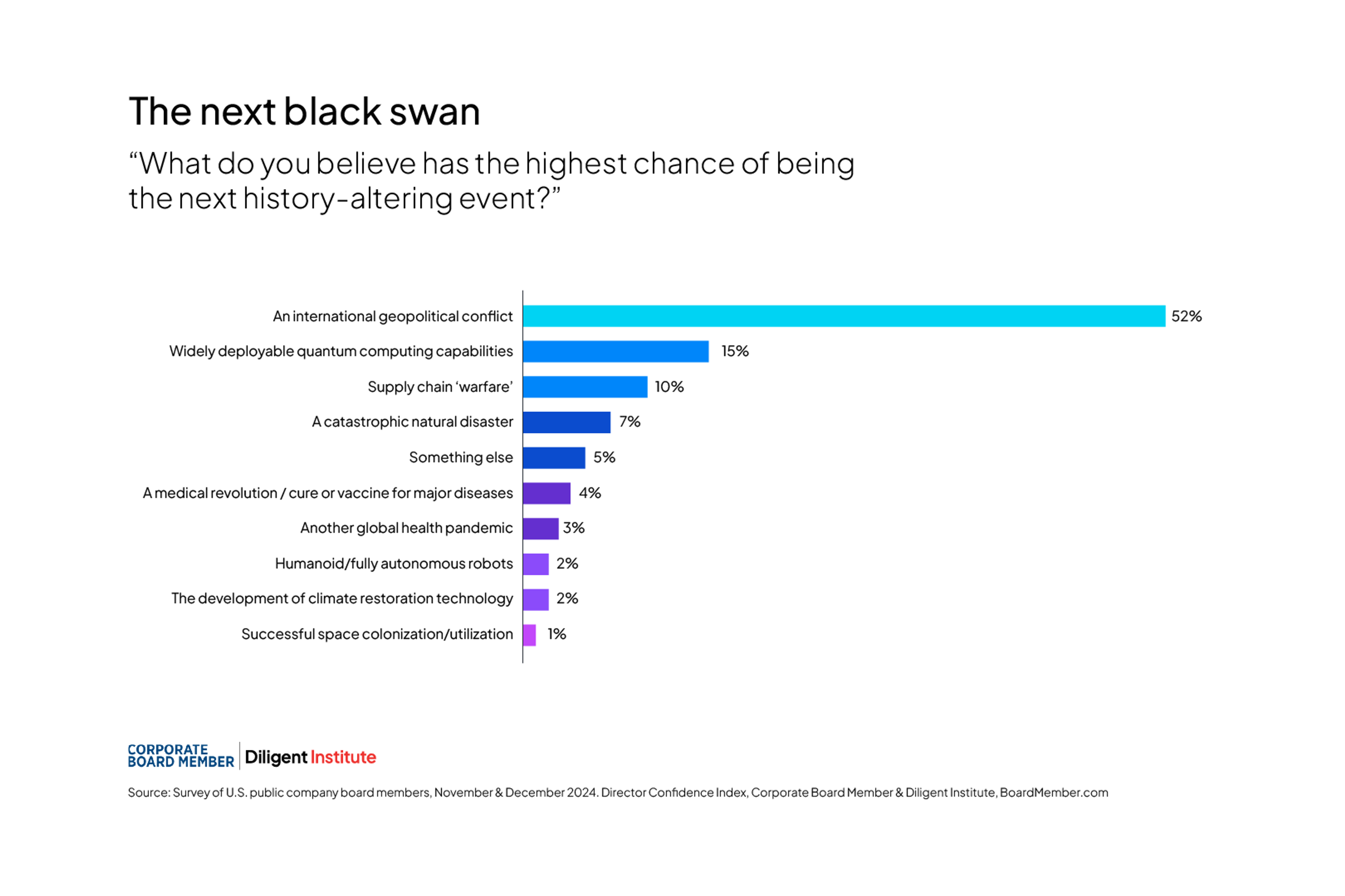 "This aligns to what we’ve been hearing from directors in our research; geopolitical risk is firmly on the radar for companies in 2025,” says Dottie Schindlinger, executive director of the Diligent Institute. “This issue has steadily crept up on the board agenda, compelling directors to reassess their strategies and priorities. Company leaders must remain vigilant, continuously evaluate the global landscape and develop robust frameworks to navigate these risks effectively.”