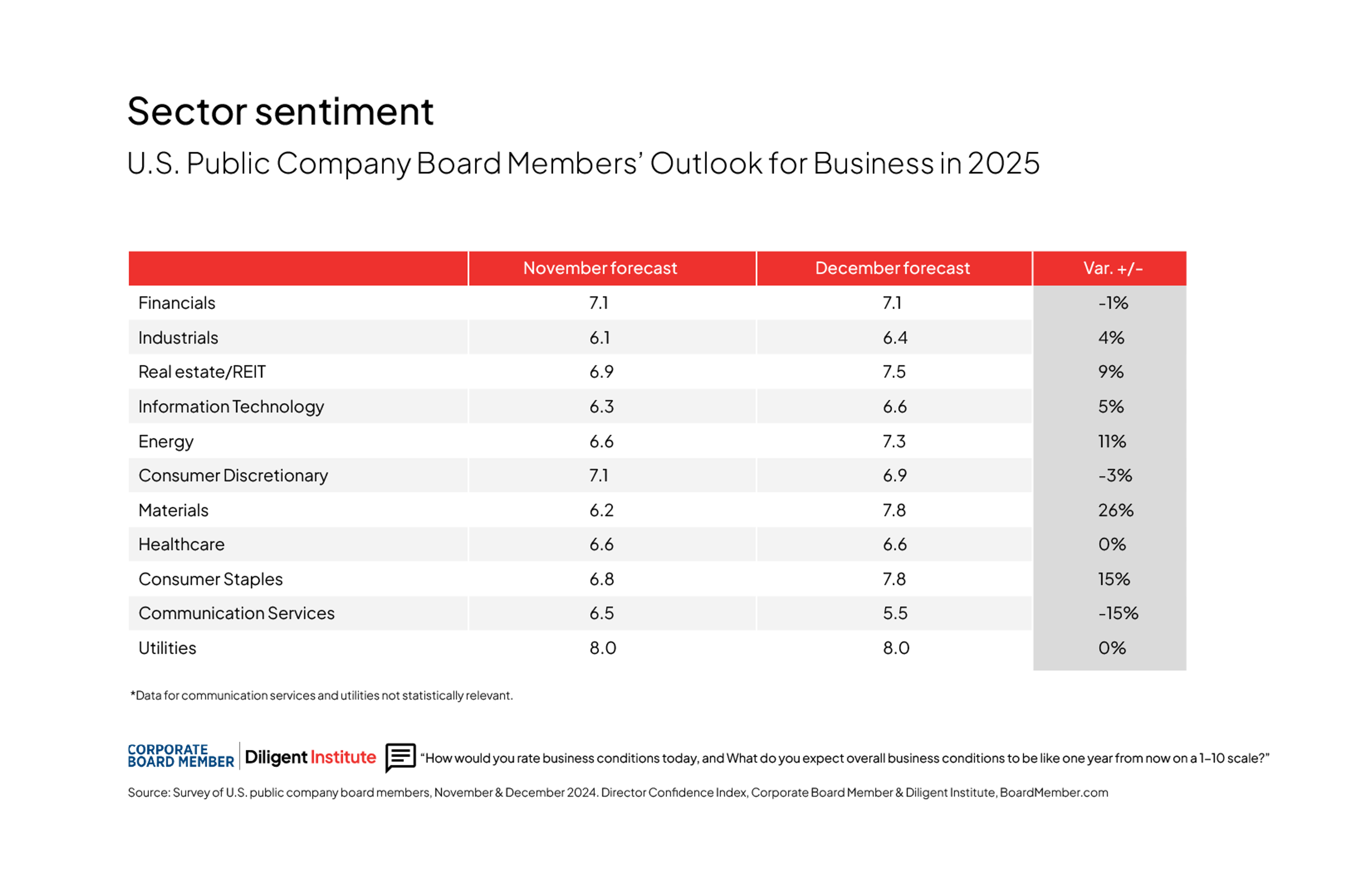 There are differences by industry, of course. Our survey finds the highest levels of optimism among board members in the materials sector, as well as within the consumer staples and energy sectors. Directors in those sectors forecast business conditions in the U.S. to hit 7.8 and 7.3, respectively, in 2025—an increase of 26, 15 and 11 percent from what they rate them today.