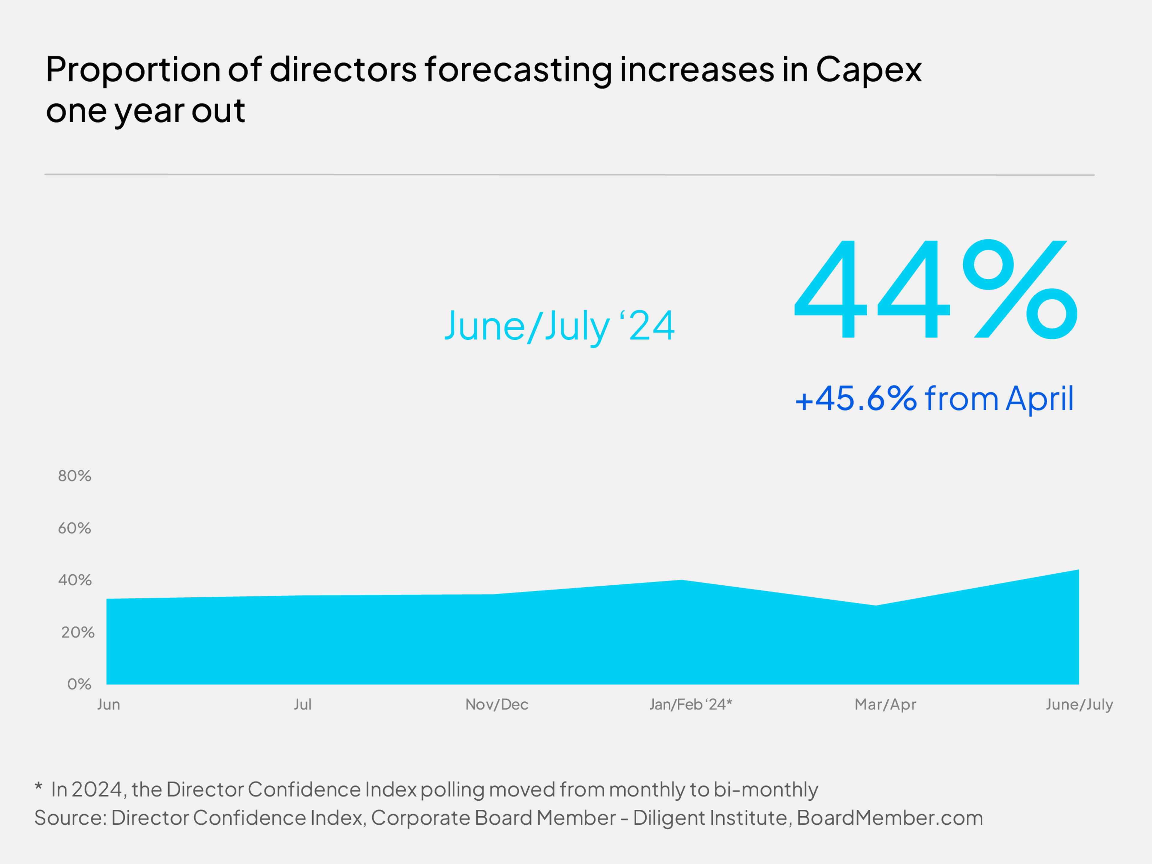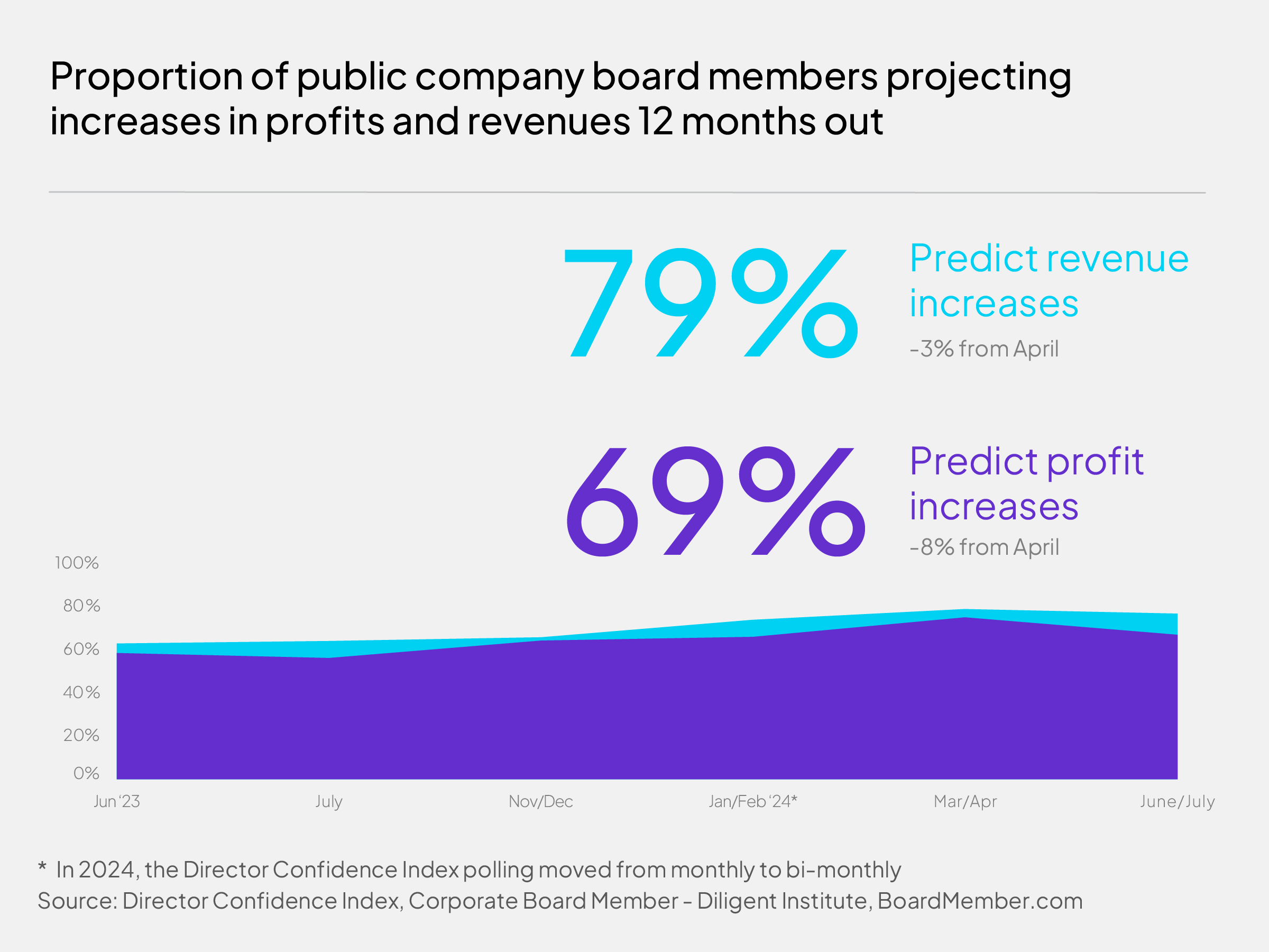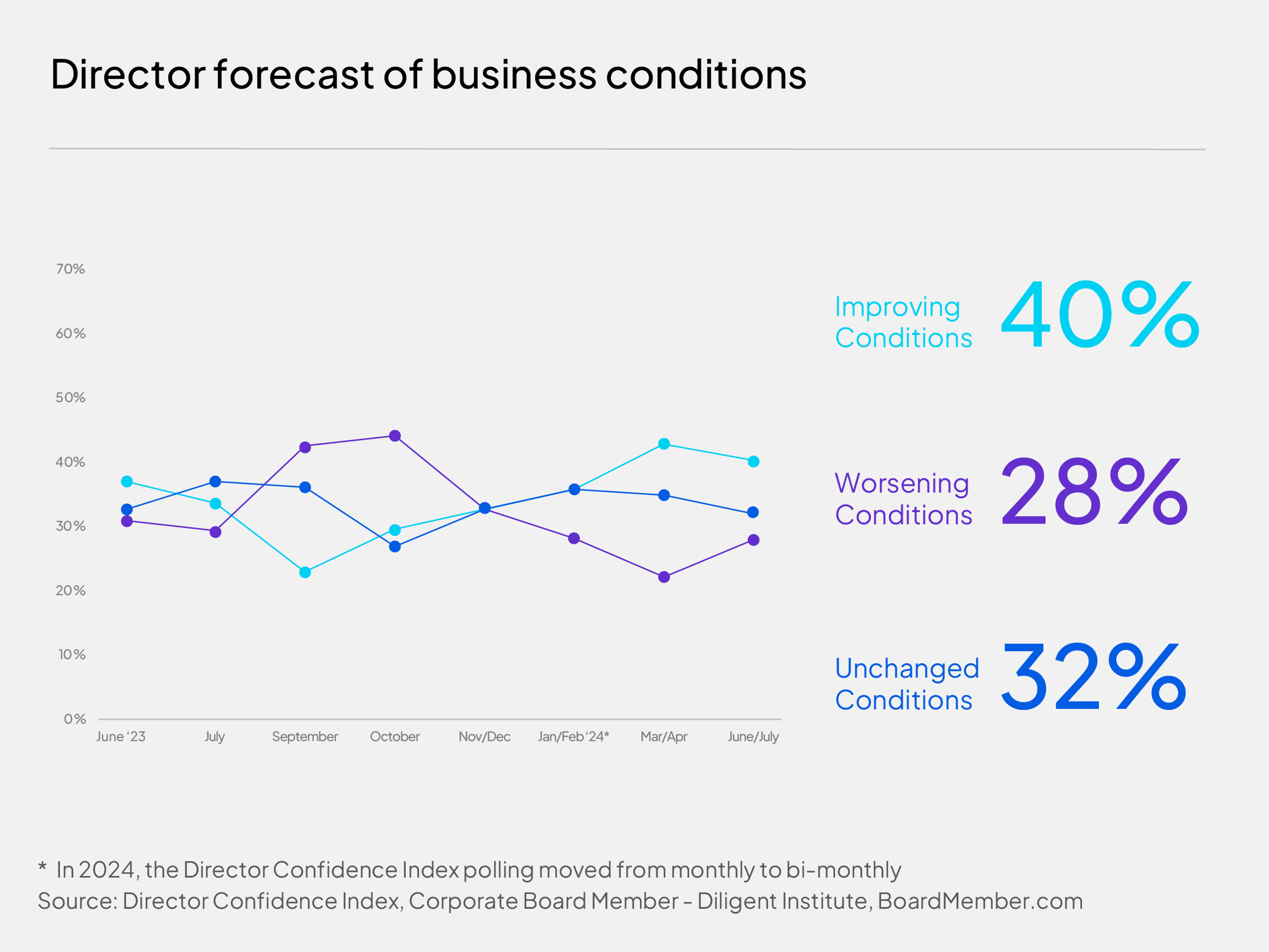 Directors’ overall optimism so far into 2024 has proven more buoyant than in the past two years: at 6.5 out of 10 on average, vs. 6.2 in 2023 and 5.8 in 2022. Forty percent in our latest poll said they believe the business climate will continue to improve over the coming year—and 32 percent say it should be about the same. But this means 28 percent of directors, like Travis, expect conditions to deteriorate in the 12 months ahead. That number has risen from 20 percent in April.