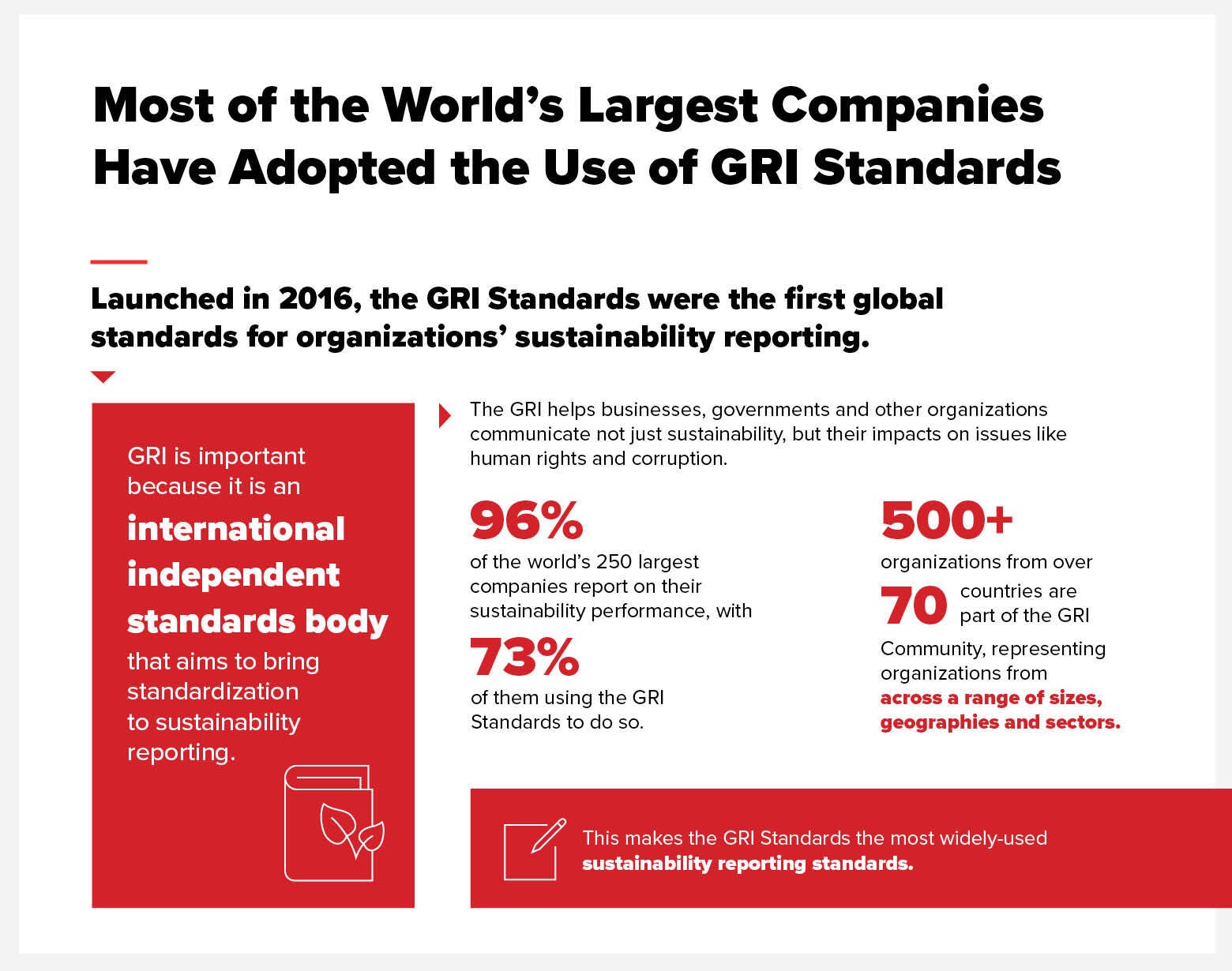This makes the GRI Standards the most widely-used sustainability reporting standards globally.